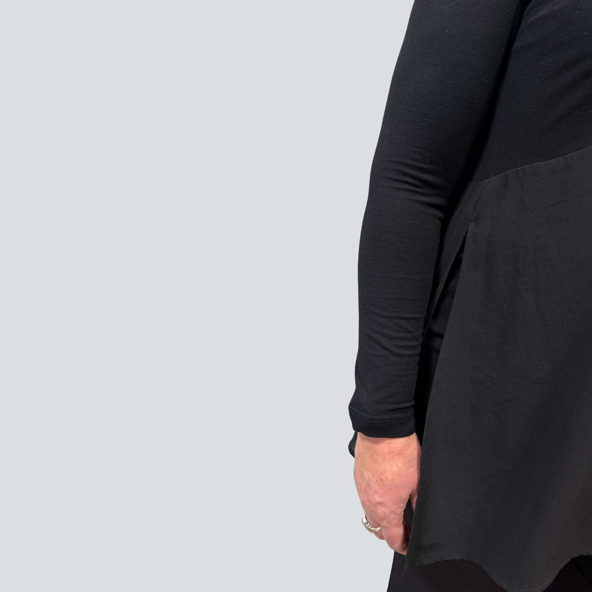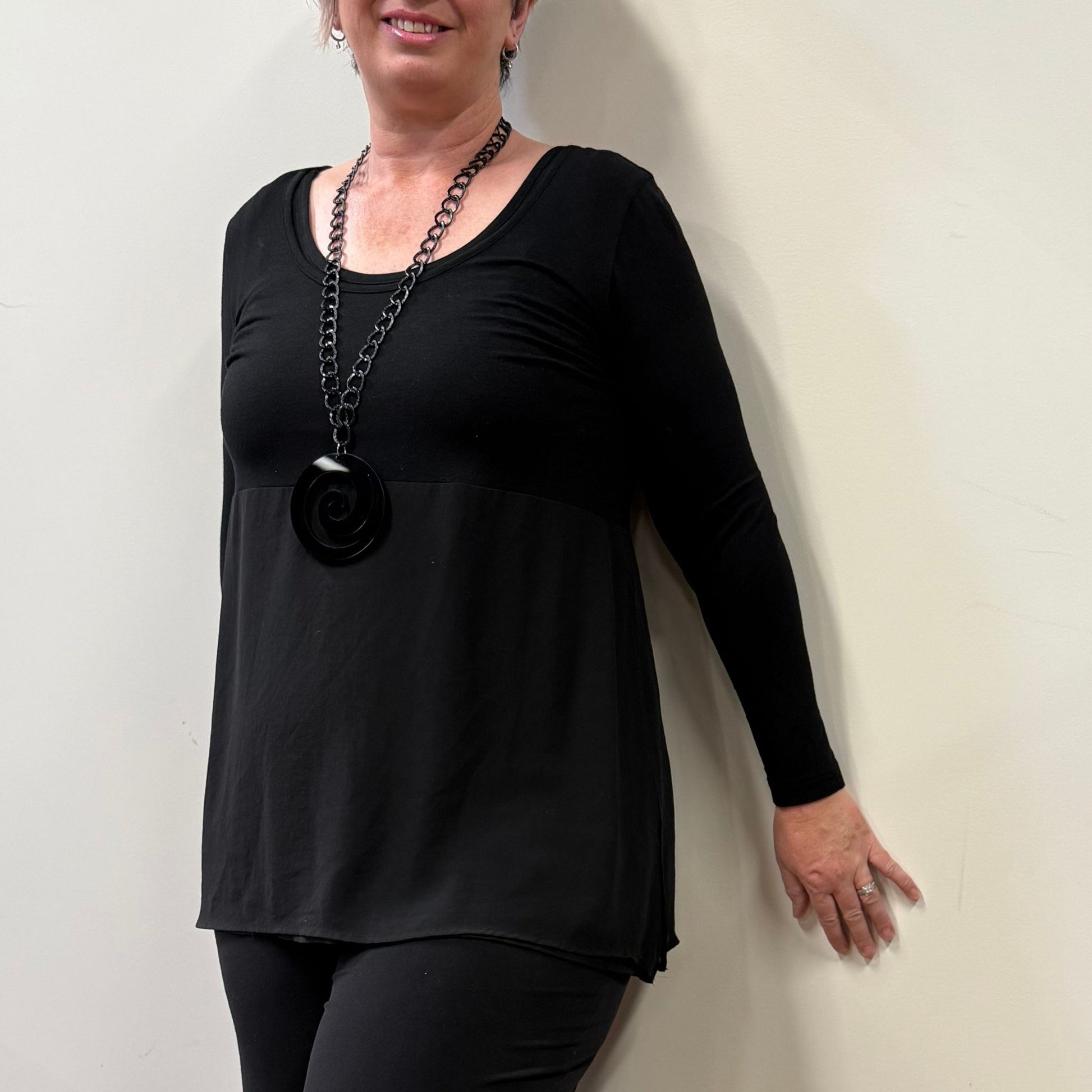 Meet the Kara Top your go to piece for effortless style and all day comfort. Made & Designed in Christchurch, New Zealand. This top combines a soft stretch viscose spandex upper for a comfortable fit with flowing double layer chiffon panels front and back that move beautifully with you. Dramatic side splits add a touch of edge making it an easy choice to dress up for evening or style casually for everyday wear.