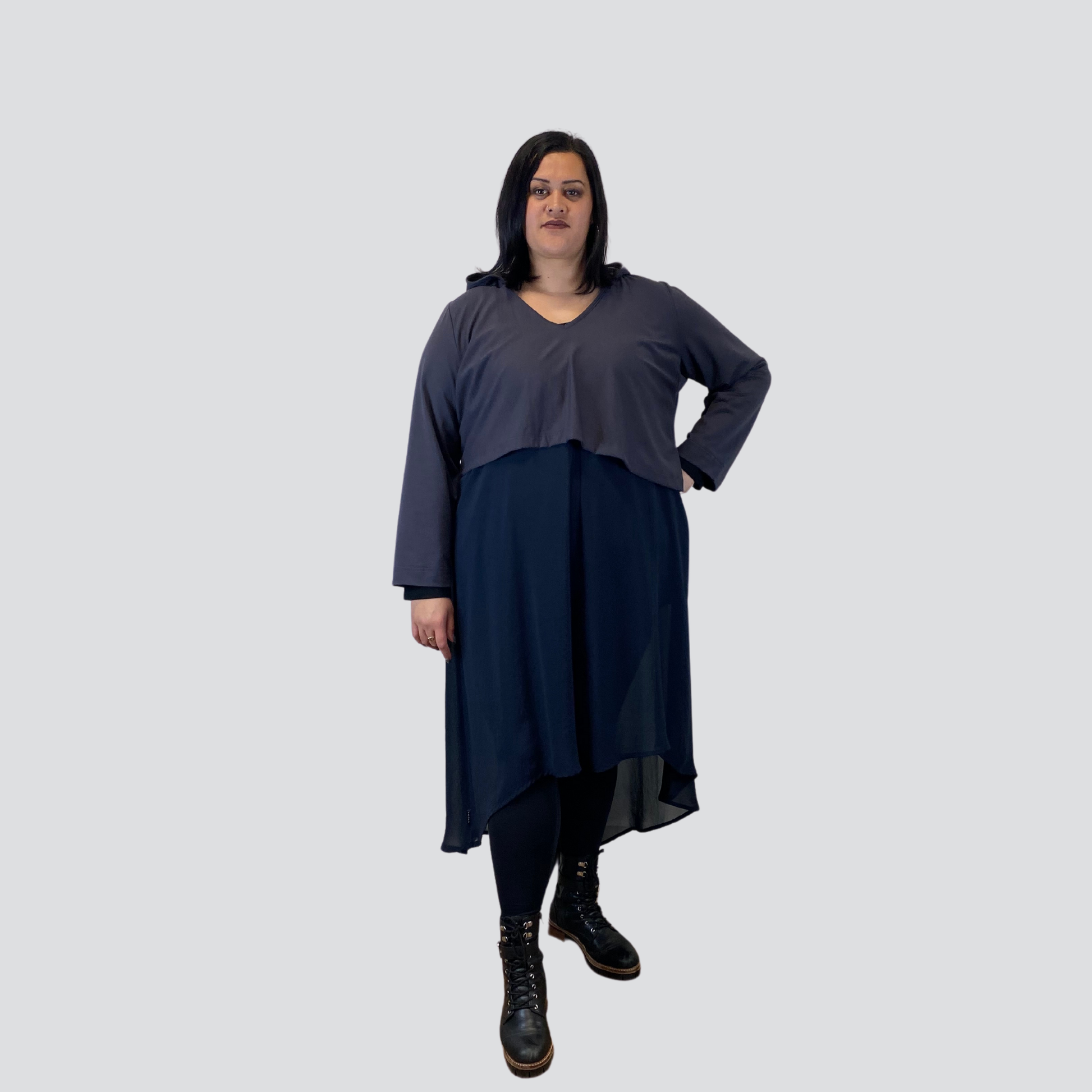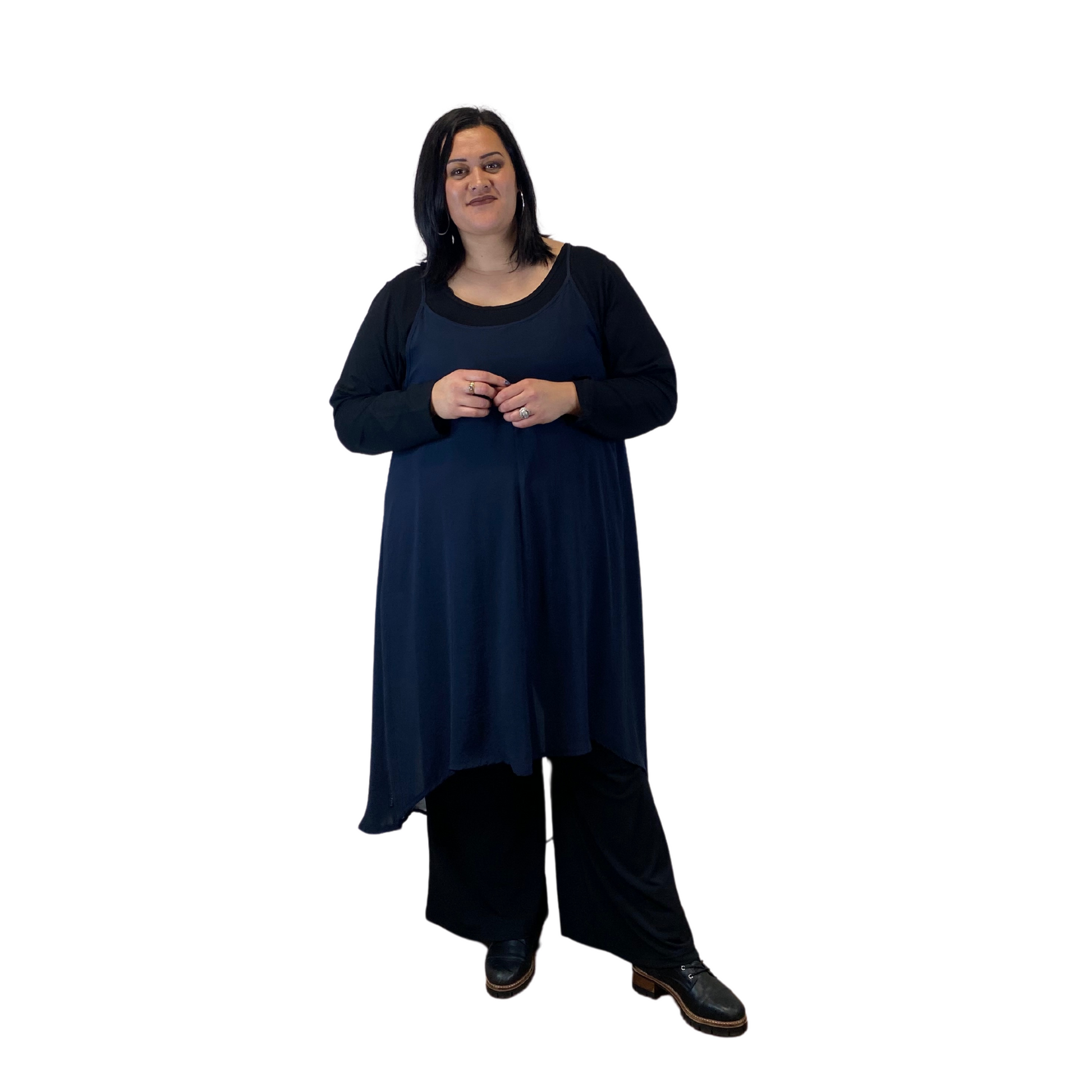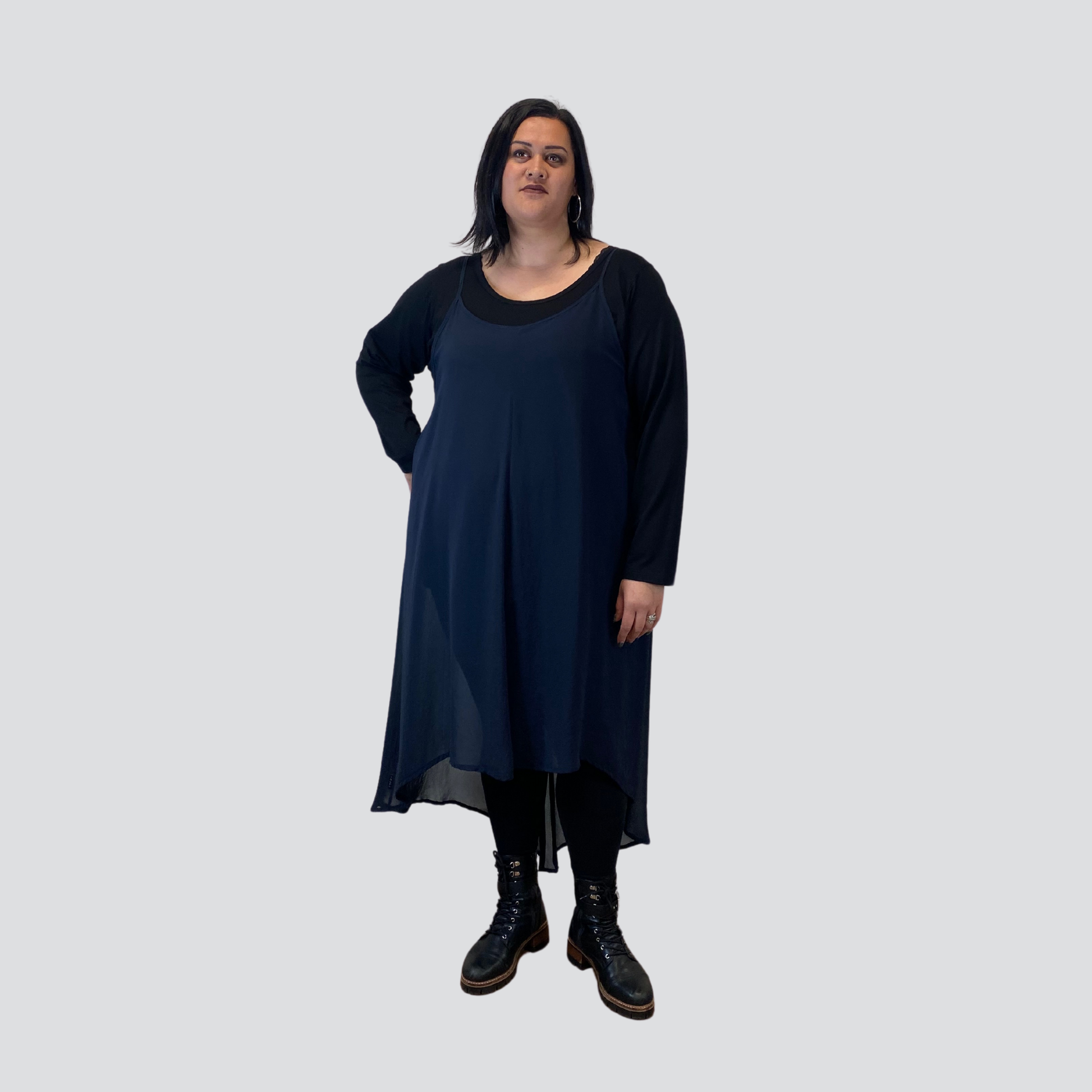 Step up your style with the Ink Chiffon Dress, designed in North Canterbury New Zealand for plus size women who love effortless style and versatility. This lightweight dress features thin straps and a flattering high low hemline, making it suitable for all heights. Perfect for layering over a long sleeve base in cooler months or a singlet with a crop jacket in warmer weather.