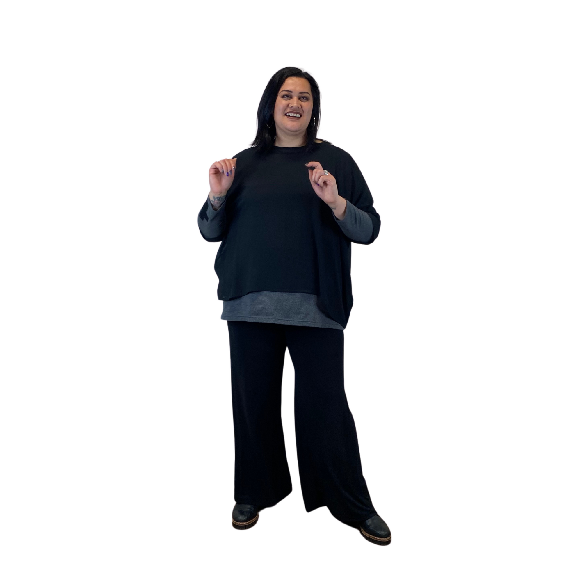 Refresh your basics with the Cross Sleeve Base Top, a versatile addition to your wardrobe designed for plus size women who value comfort and edgy style. Made and designed by Jo Kaisa in North Canterbury, New Zealand. This top features a grey base with a distinctive black cross detail at the end of one sleeve, adding a subtle yet edgy touch to your look.
