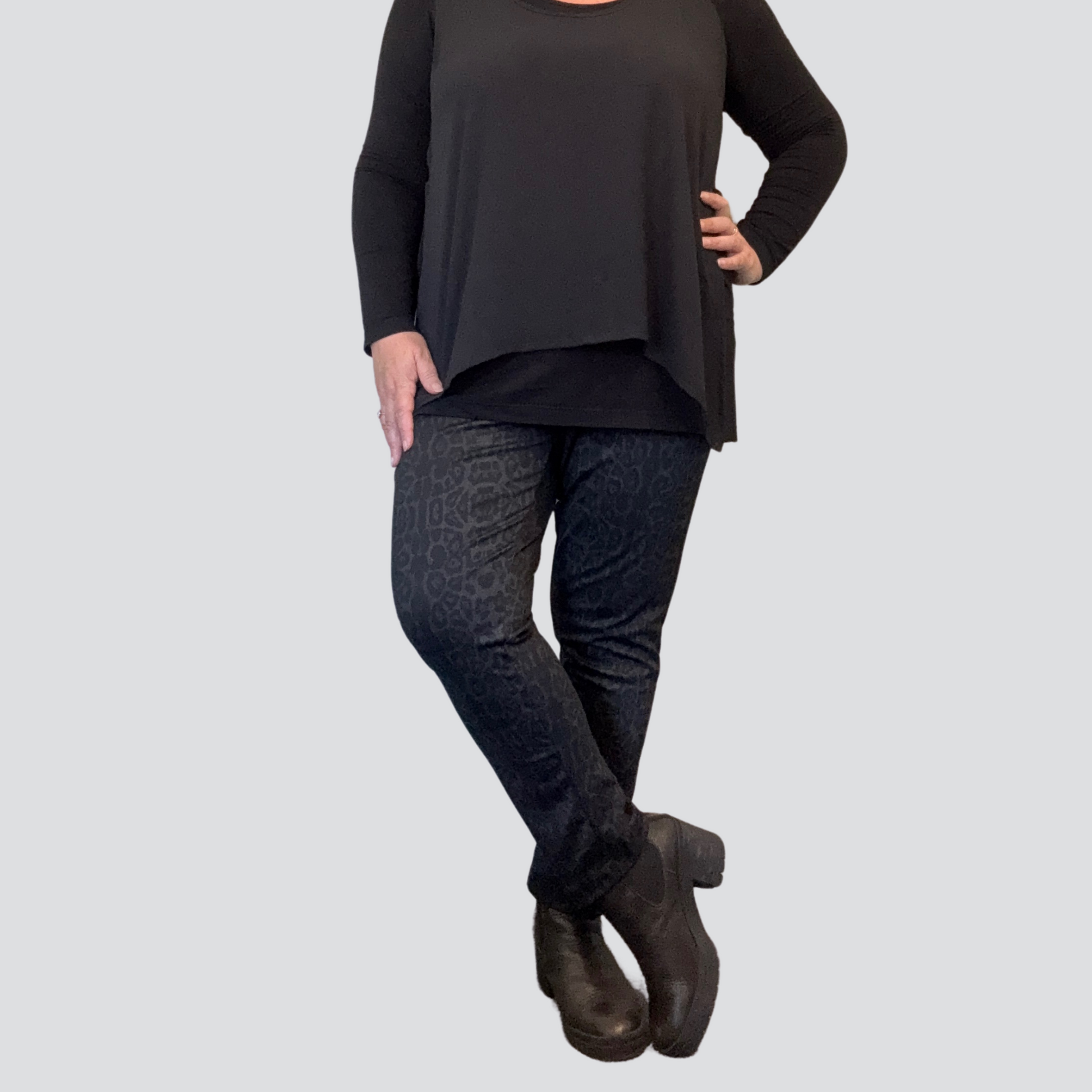 The perfect slimline pant to wear under longer tops and tunics, giving you that edgy, effortless look. Designed for comfort and style, these are your go to for everyday wear with a subtle edge. The discrete grey and black animal print adds just the right amount of attitude.