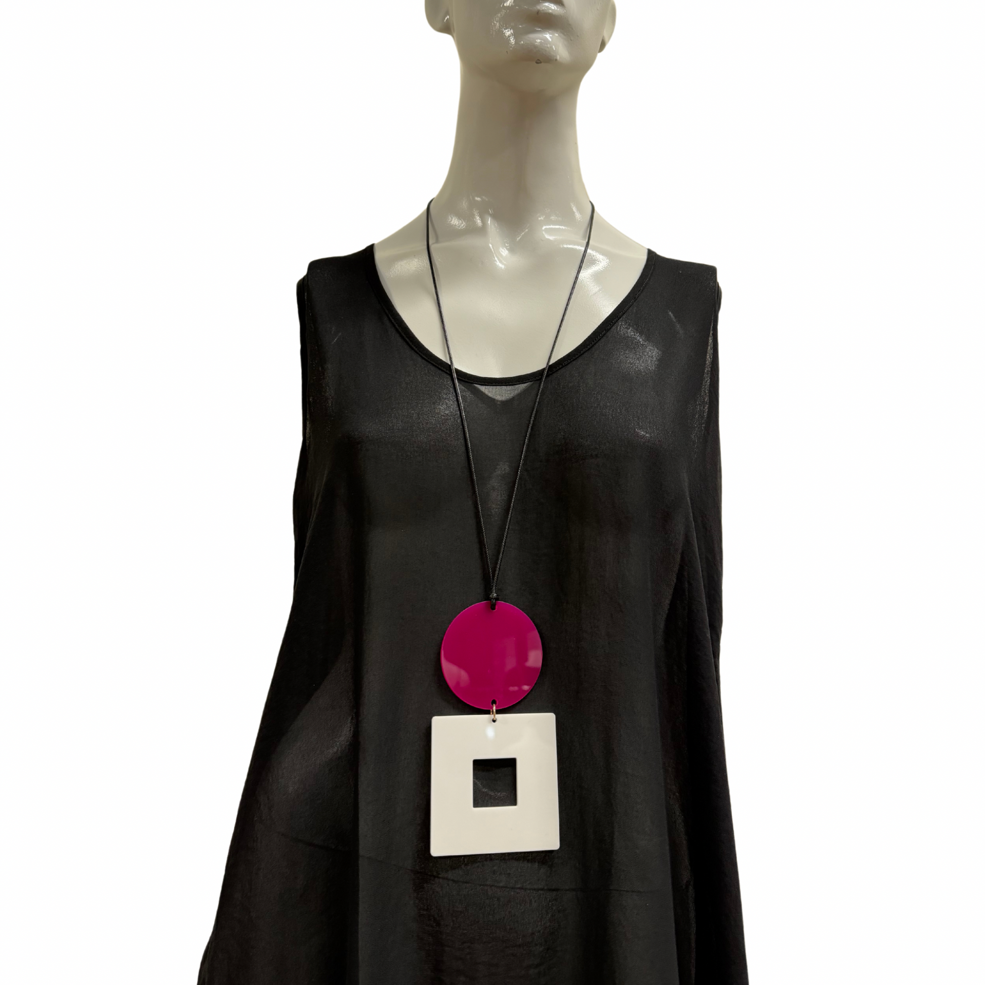 Add a playful pop to your outfit with the Pink & White Duo Necklace. Featuring a bold pink circle paired with a white cut-out square, this lightweight statement piece is handcrafted in Christchurch, New Zealand by M&D Jewellery.
