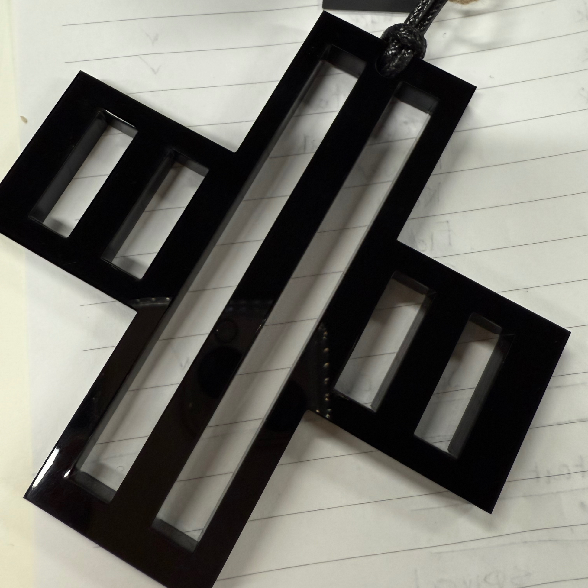 Make a statement with the Black Cut Out Cross Necklace, featuring a modern silhouette with cut outs. Made in Christchurch, New Zealand from lightweight acrylic, this piece is easy to wear and adds instant attitude to any outfit.